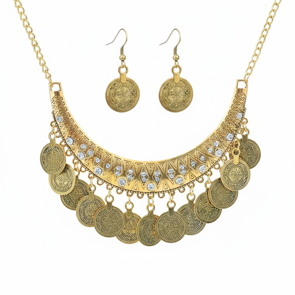 A vintage-inspired gypsy tribal necklace and earrings set featuring coin tassels and rhinestones. This trendy jewelry set is perfect for parties, occasions, anniversaries, or as a bold statement gift