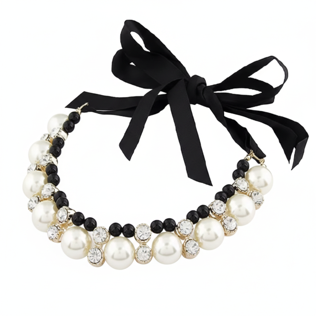Pet necklace featuring imitation pearls with a delicate ribbon bow design. Crafted from durable alloy and rhinestones for lasting shine. Lightweight and suitable for all pets