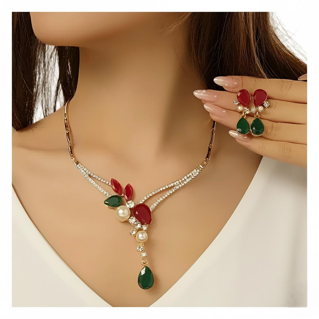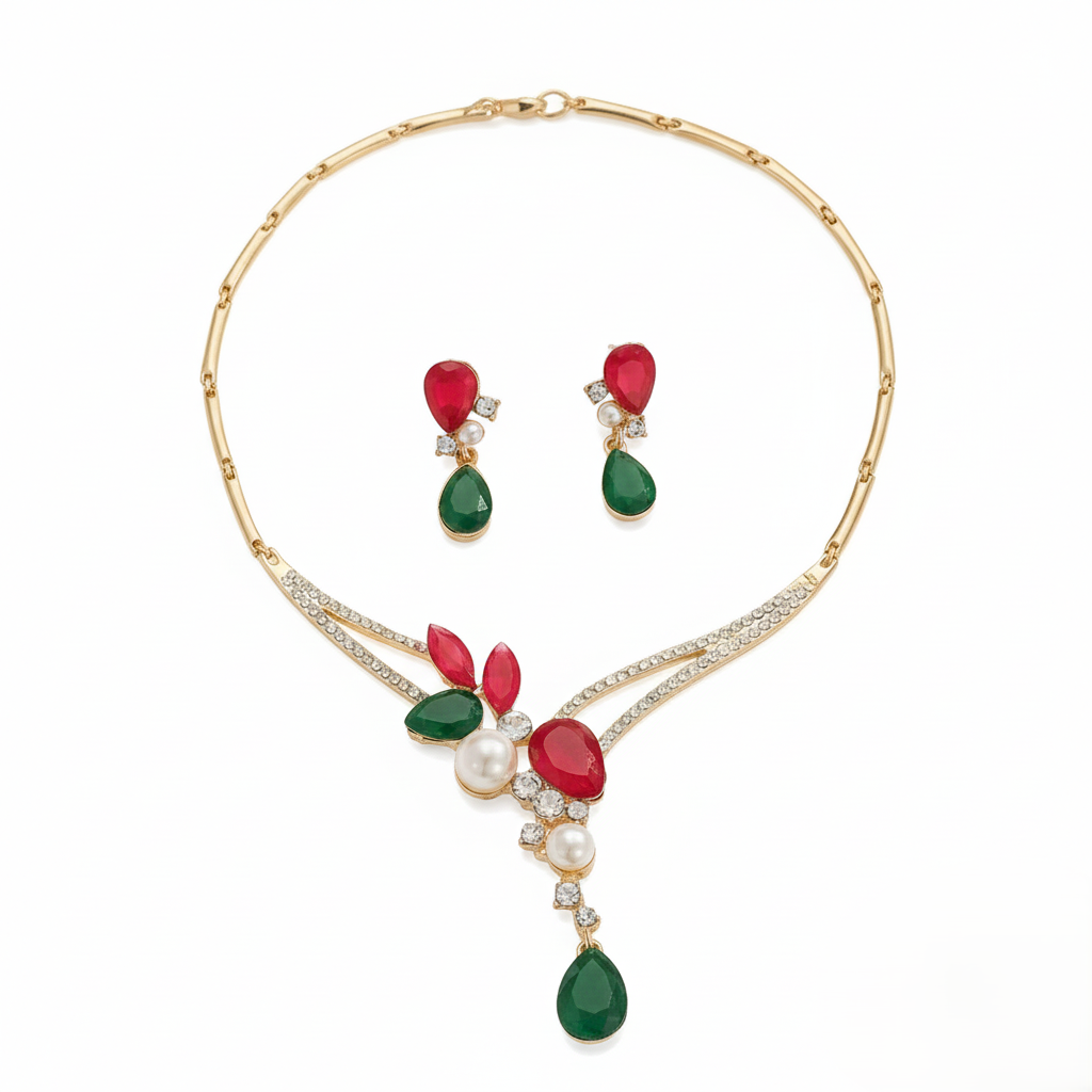 A stylish necklace and earrings set crafted from durable zinc alloy metal, designed for fashionable occasions. Lightweight for comfortable wear, this set adds a chic touch to any look