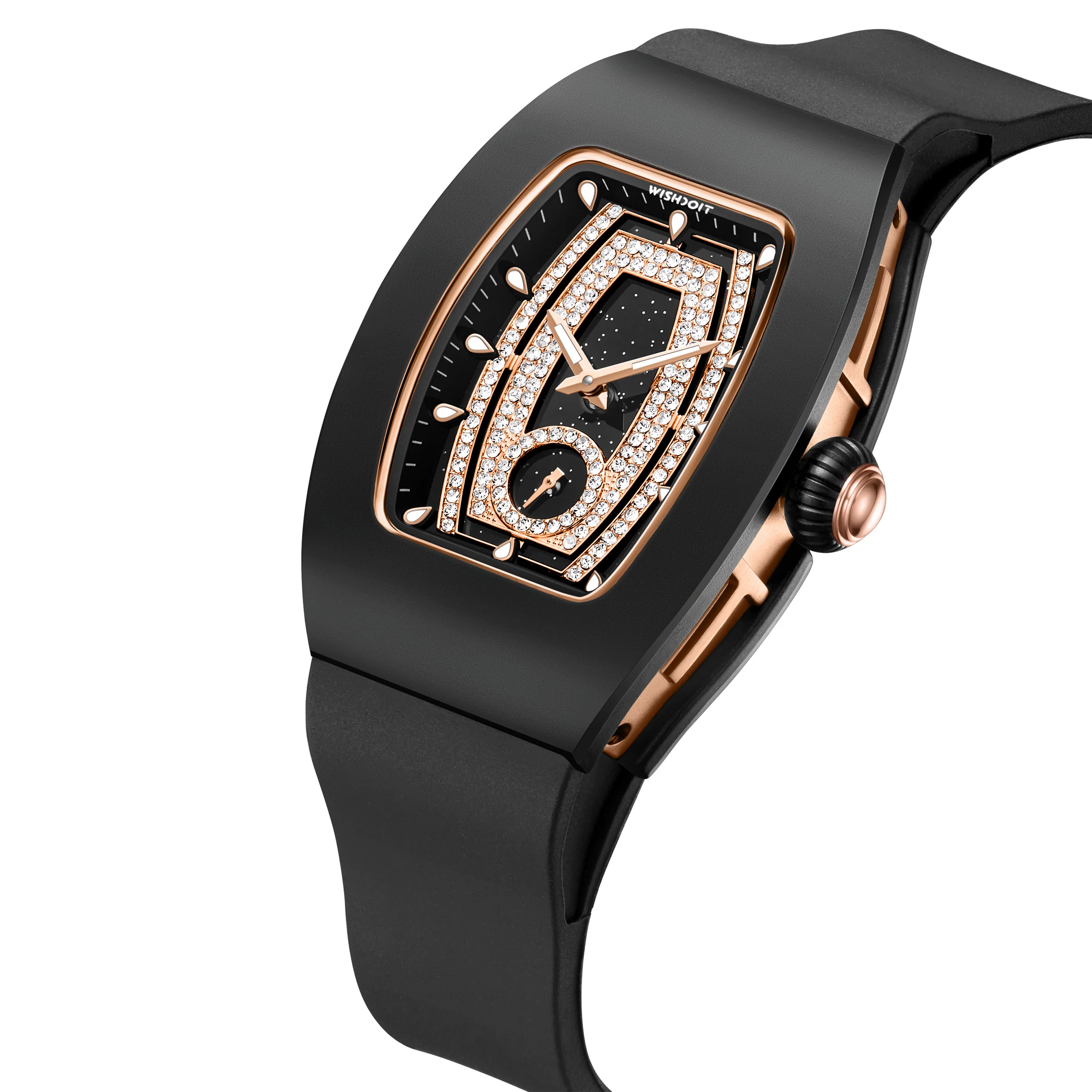 Elegant tonneau-shaped Quartz watch with a ceramic case and strap, sapphire crystal dial window, and movement for precise timekeeping. Lightweight design for fashion and casual wear. Precision, Elegance, and Everyday Style