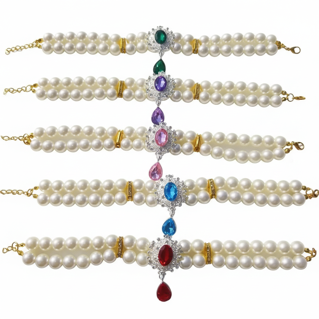 Elegant pet necklace featuring double layers of imitation pearls and a sparkling rhinestone pendant. Crafted with durable rhinestones and alloy accents, secured by a buckle closure. Suitable for all pets