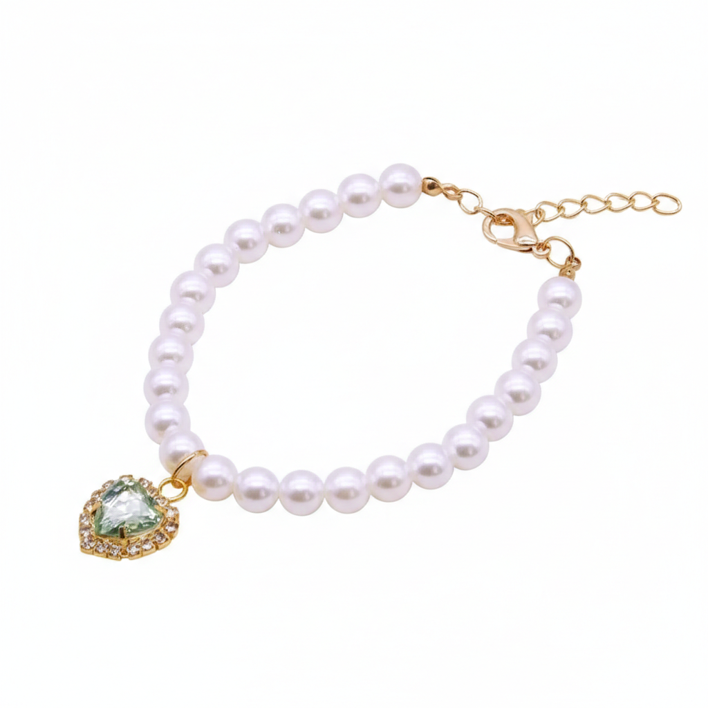 Elegant pet collar crafted from imitation pearls, alloy, and rhinestones for durability and comfort. Features an adjustable chain for a perfect fit and a sparkling heart pendant for added charm. Suitable for all pets