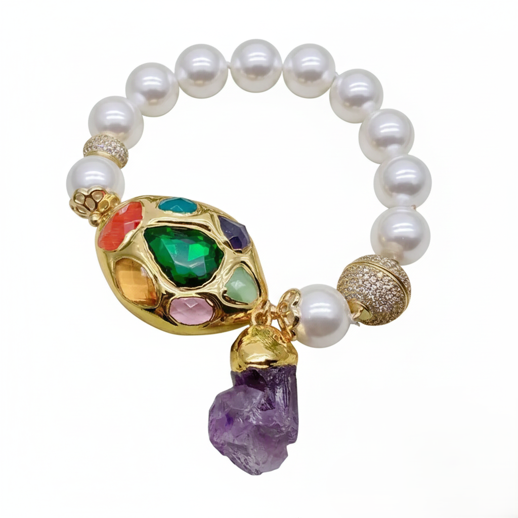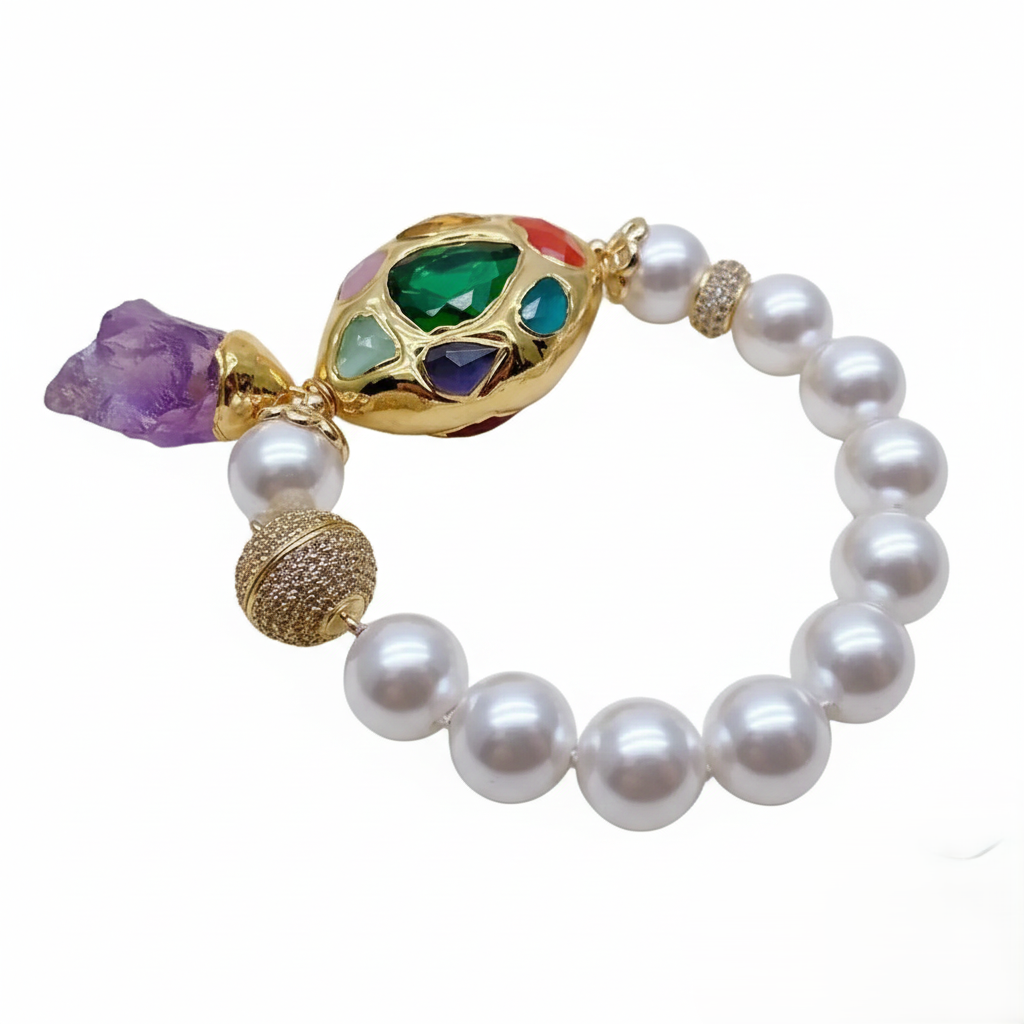 Multi-Color Crystal Bracelet | 12mm White Seashell Pearls | Amethyst Charm | 18K Gold-Plated Clasp