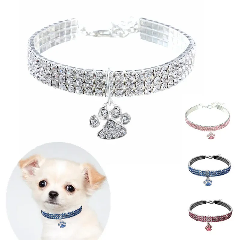 Stylish pet necklace crafted from durable alloy with sparkling rhinestones in mixed colors. Features a cute paw-print charm for added elegance. Suitable for all pets