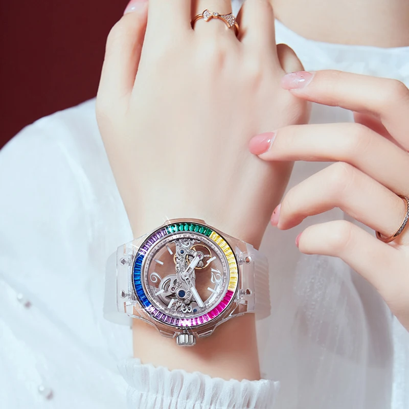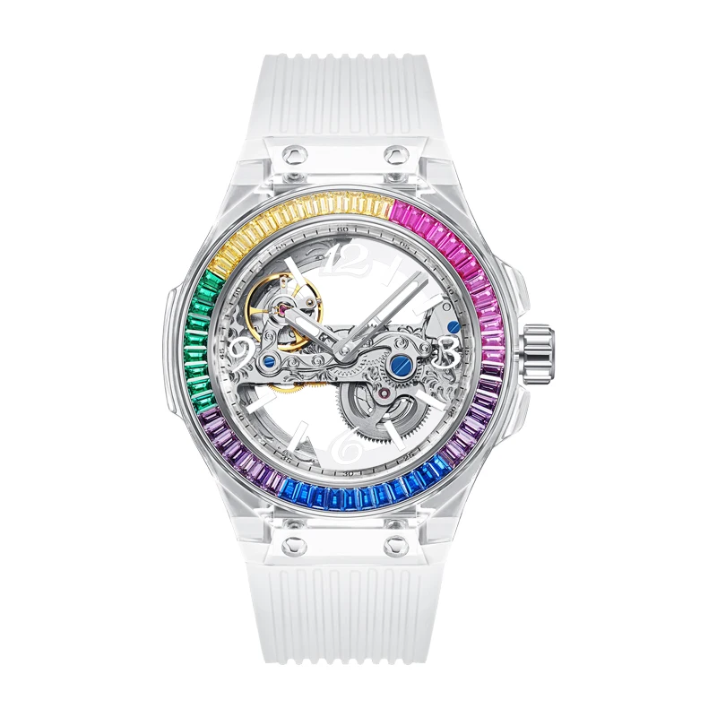 A striking mechanical watch with a fully transparent design and diamond skeleton detailing. Powered by automatic self-wind movement, luminous accents, and 3Bar water resistance. A bold sport-style timepiece with original design. Luxury, automatic precision, and bold elegance